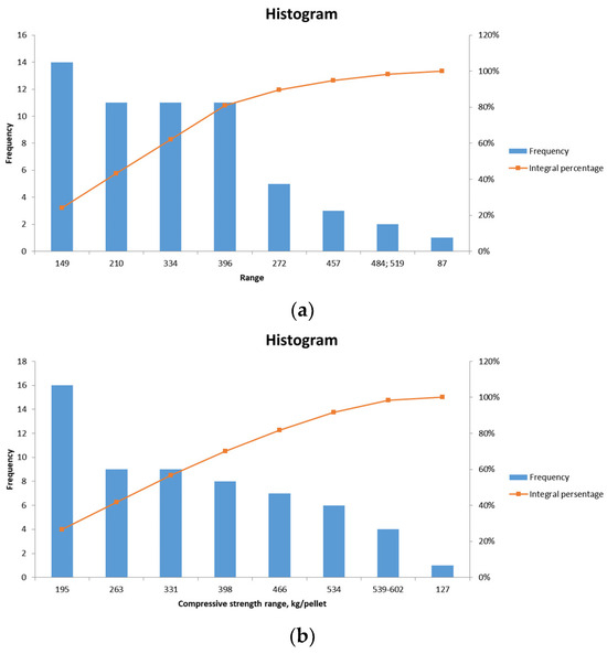 Frequency distribution graph of compressive strength values of pellets No. 1 (a), pellets No. 2 (b).