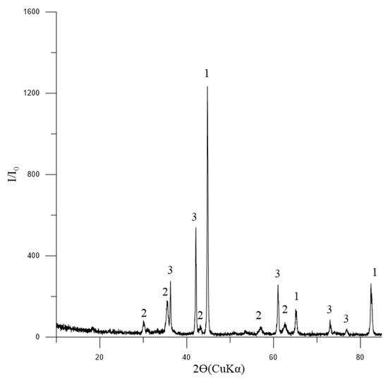 Diffractogram of reduced pellets No. 1: 1—Femet [01-076-6587]; 2—Fe3O4 (magnetite) [01-088-0315]; 3—FeO (wüstite) [01-077-7981].