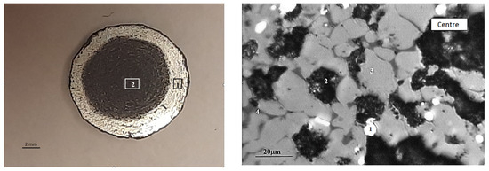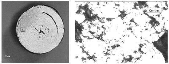 Typical macrostructure of metallized pellets: left (1—edge, 2—center), right (in the center: 1—Femet; 2—pores).