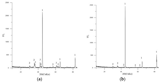 Diffractogram of metallized pellets No. 2: (a) 3 h of exposure; (b) 4 h of exposure: 1—Femet [01-076-6587]; 2—Fe3O4 (magnetite) [01-088-0315]; 3—FeO (wüstite) [01-077-7981].