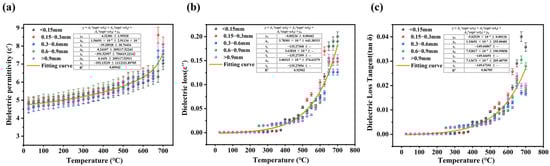 The effective response of a material to microwaves is a prerequisite for it to be heated by microwaves. Generally, materials that strongly respond to microwaves can be heated efficiently. The dielectric properties are key factors influencing the microwave absorption performance of materials. Among these, the dielectric permittivity, dielectric loss, and loss tangent are fundamental parameters used to evaluate dielectric properties [28,29]. Therefore, investigating the dielectric properties of LiH is essential for optimizing its microwave thermal processing. The dielectric properties of LiH powders with varying particle sizes were assessed using the resonant cavity perturbation method, with variations in dielectric properties depicted in Figure 1. Within the temperature range of room temperature to 700 °C, the dielectric permittivity, dielectric loss, and dielectric loss tangent of LiH increase with temperature. This increase is attributed to the enhanced crystallinity of the sample, which leads to a slight improvement in dielectric performance. The dielectric loss of LiH shows a gradual increase from room temperature to 400 °C, followed by a sharp rise beyond 400 °C. This behavior may be linked to a phase transition in LiH induced by elevated temperatures. The dielectric permittivity of LiH powders with different particle sizes exhibits complexity. Specifically, LiH powders in the particle size range of 0.6–0.9 mm demonstrate favorable wave-absorbing properties. The dielectric permittivity of LiH varies as a function of temperature, ranging from 4.561 to 8.553. The differences in dielectric properties among the powders of various sizes are not obvious; thus, we utilize the fitted results as working parameters for simulating the microwave heating of LiH.