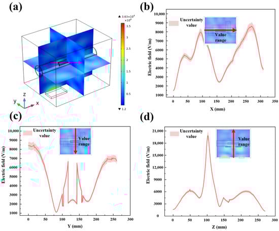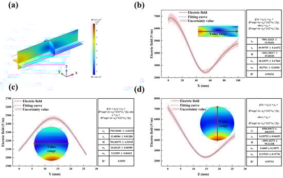 Electric field distribution in the LiH region during microwave heating of LiH and its fitting results (a) electric field distribution in the LiH region; (b) distribution of electric field in the Z–X plane along the X-axis; (c) distribution of electric field in the Y–Z plane along the Y-axis; (d) distribution of electric field in the X–Z plane along the Z-axis.
