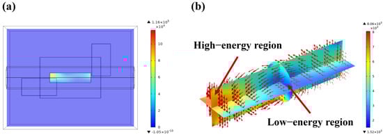 Figure 5 shows the distribution of resistive losses along the central X–Y plane. The figure shows that the resistive losses are negligible in the surrounding environment, with the primary resistive losses occurring within the LiH material. This is due to the fact that when current flows through LiH, a portion of electrical energy is transformed into thermal energy due to the resistive properties of LiH, as described by the coupling equation in Equation (2). The cavity is constructed from metallic materials, which act as microwave reflectors, reflecting rather than absorbing microwaves. Additionally, the surrounding environment consists of argon gas, a nonpolar molecule with a relatively low dielectric constant and a minimal loss factor, resulting in weak microwave absorption. Therefore, the distribution of resistive loss in the surrounding environment can be neglected. This indicates that, during microwave heating, the LiH material is the main area of energy absorption, with resistive losses concentrated within these regions [37]. Notably, the highest resistive losses, reaching 1.16 × 105 W/m3, are observed in the regions of highest electric field strength within the LiH material. This results in a reverse heating gradient, where higher electric field strengths lead to greater absorption of microwave energy, producing more heat [38]. This heat then dissipates from the high-temperature regions of the material towards the periphery, creating a temperature gradient from the center outward. The redistribution of the electric field and the concentration of resistive losses during the heating process are critical factors influencing the overall heating effectiveness of the LiH material.