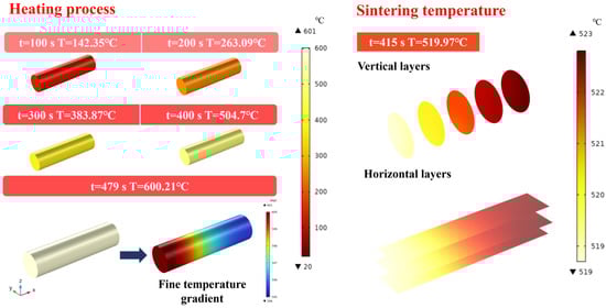 Figure 6 illustrates the temperature variation of LiH under microwave heating over time, with temperature measurements taken at 100 s intervals. As shown, LiH reaches the sintering temperature (520 °C) within 415 s, highlighting its rapid heating characteristics and the efficiency of microwave heating. Due to differences in the internal electromagnetic field of LiH, temperature distribution is not entirely uniform. Analysis of the temperature distribution within LiH at 479 s reveals a temperature difference of 5 °C between low- and high-temperature regions, with an overall relatively uniform temperature distribution.
