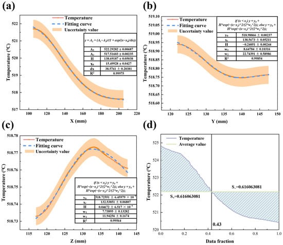 Simulation and its fitting results at 520 °C during microwave heating of LiH (a) distribution of Z-X plane electric field along the X-axis; (b) distribution of Y–Z plane electric field along the Y-axis; (c) distribution of X–Z plane electric field along the Z-axis; (d) distribution of the overall temperature field in the LiH region.
