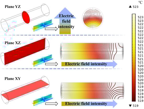Further analysis of the internal temperature distribution of LiH is shown in Figure 8, which presents isothermal contour plots of LiH at sintering temperature along three planes. It can be observed that isotherms are denser in regions with high electric field strength and become sparser in the direction of decreasing temperature gradient. Heat is conducted from areas of high electric field strength to areas of lower intensity, enhancing the uniformity of the internal temperature distribution of the material. Overall, the analysis indicates that microwave sintering not only facilitates rapid heating of LiH but also ensures uniform temperature distribution during the heating process, effectively achieving homogeneous densification of the material.