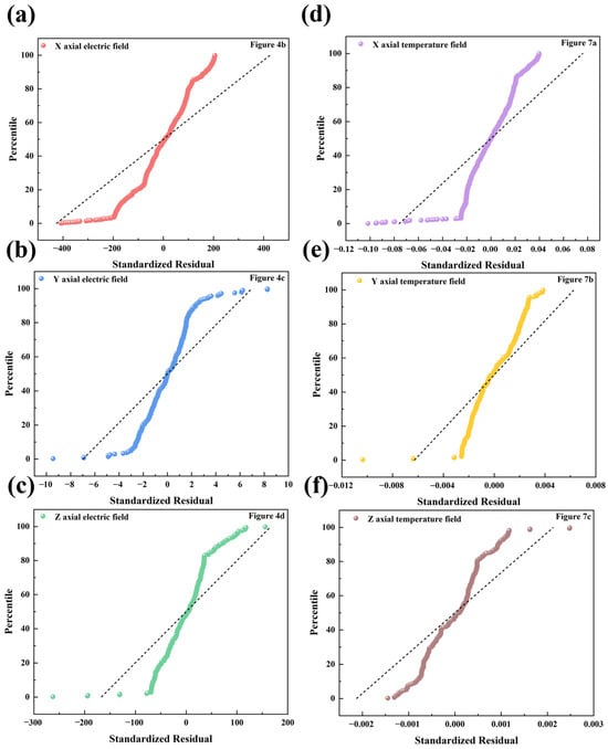Normal probability plots of data fitted: (a) X-axis electric field; (b) Y-axis electric field; (c) Z-axis electric field; (d) X-axis temperature field; (e) Y-axis temperature field; and (f) Z-axis temperature field.