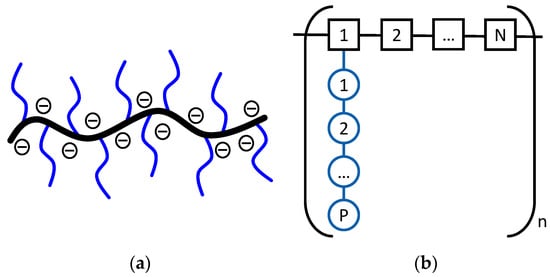 The knowledge of PCEs’ performance was based on a trial and error approach until recently, when Flatt et al., intending to understand the microstructure–property correlation, started to rationalise these relationships [11,12,13]. They defined a model repeating unit (Figure 1b), which describes the molecular structure of the PCE with only three characteristic structural parameters: the number of ethylene glycol units in the side chain (P), the number of monomer units in the repeating unit (N), and the number of repeating units in the chain (n).