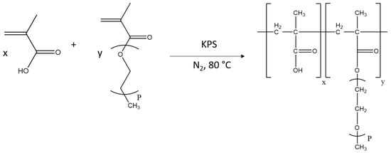 As mentioned, Marchon et al. carried out their research using PCEs synthesised through the esterification of a poly acrylic acid backbone with methyl poly(ethylene oxide), as they claim that this route offers the best control on the microstructure of the polymer. Nonetheless, there is an alternative synthesis method with wide use in industry, which is the free radical copolymerisation of methacrylic acid and polyethylene glycol methacrylate (PEGMA) macromonomer (see Figure 2). Emaldi et al. proved that when the chain length of the PEGMA was long enough to make it soluble in acidic media, copolymers with well-controlled molecular structures and homogeneous compositions could be achieved by following semi-batch polymerisation strategies [14,15,16]. This approach is the most common method due to its simple experimental process and cost-effectiveness [2].