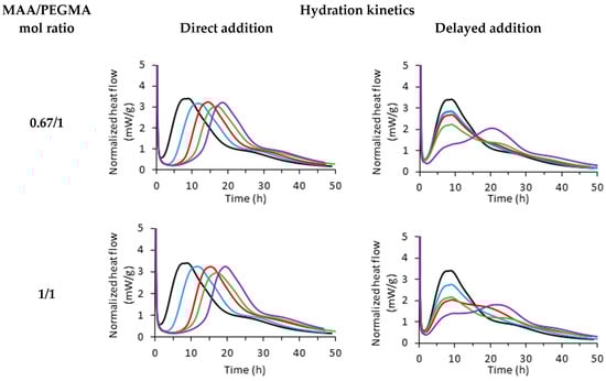 The results on the left side (direct addition) were adapted and reprinted with permission from our previous publication [17]. There, it can be observed that for any MAA/PEGMA ratio, as the PCE concentration increases, the hydration peak is more retarded. Notably, the overall shape of the plot is the same, but it is displaced to longer times. As it was discussed, the retardation in hydration () was found to be proportional to the carboxylate dosage, and all PCEs fit in a master curve, proving that the microstructure of PCEs could be correlated to the hydration delay of the OPC. These results are comparable to the delayed addition data published by Marchon et al. [3]. It is believed that this discrepancy is due to the content of C3A and the reduced role of ettringite in competing for the PCE adsorption [17,18].