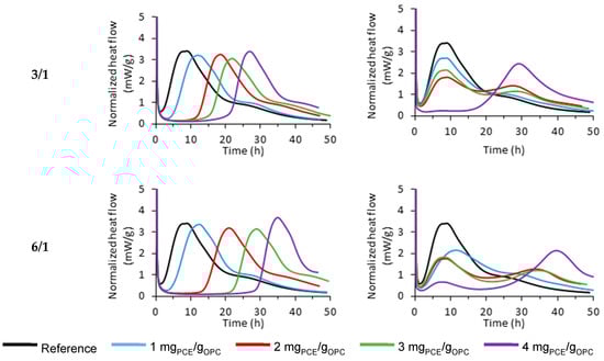 Released heat of hydration over time for PCEs of series M and different MAA/PEGMA molar ratios (0.67/1, 1/1, 3/1, and 6/1) at different PCE dosages (blue—1 mgPCE/gOPC; red—2 mgPCE/gOPC; green—3 mgPCE/gOPC; purple—4 mgPCE/gOPC). Black line belongs to the reference sample, to which no PCE was added. Data taken from reference [17].