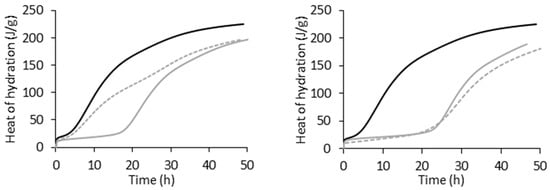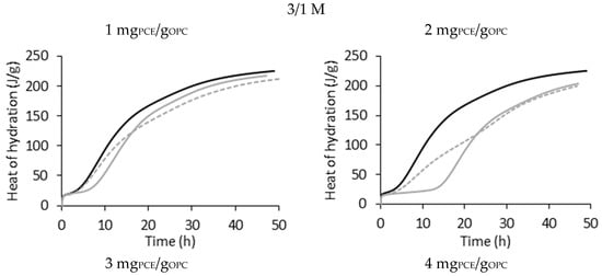 Figure 4 shows the heat of hydration () over time for the PCE 3/1 M at different dosages using direct (continuous grey line) and delayed addition (dashed grey line) as an example. The rest of the systems show a similar trend and are presented in Figure S2 in the Supplementary Materials.