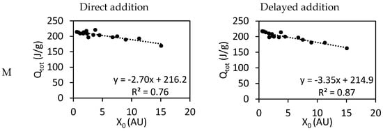 In Figure 5, the total released heat after 48 h is presented over the carboxylate dosage. This parameter, named X0 is the number of carboxylate groups added to the system and can be calculated using Equation (4) and has a dependence on the PCE dosage (), molar ratio of MAA/PEGMA (), and molar mass of the repeating unit ( Equation (3)).