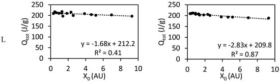 On the other hand, the bottom graphs in Figure 7 show the reduction of the heat of the main hydration peak () over the number of carboxylate groups (X0) added to the system for the delayed addition method. When series M is analysed, a linear dependence is observed, which is a function of the MAA/PEGMA molar ratio as in the case of in direct addition. Nevertheless, series L differs significantly from the results analysed so far. When PCEs with low MAA/PEGMA molar ratios are used, almost no reduction in hydration is observed, even if a difference was observed when analysing the hydration curves (see Figure 3 and Figure S1 in the Supplementary Materials). Moreover, if the slopes for PCEs with the same MAA/PEGMA molar ratios and different series are compared, a significant difference is observed. Therefore, we can infer that has a dependency on the side chain length (P). Because the system does not show any retardation in hydration and the heat released is P-dependent, the analysis proposed by Marchon et al. [3] and applied for a direct addition system when the same PCEs and OPCs were used [17] cannot be pursued further.