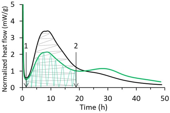 where is the difference in the heat released during the main hydration peak between the reference () and each system (). The main hydration peak was considered from point 1 to point 2, as shown in Figure 6.