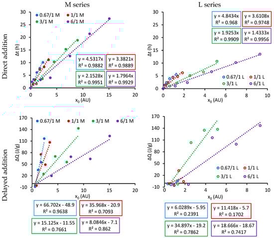 The upper graphs shown in Figure 7 present the retardation of the maximum of the hydration () curve plotted as a function of the number of carboxylate groups (X0) calculated using Equation (4) for the direct addition method. In agreement with the results of Marchon et al. [3], the retardation of the hydration of the main peak increases linearly with the amount of carboxylate groups added to the system. In addition, for the same MAA/PEGMA molar ratio, the results of both series can be fitted to the same plot (as demonstrated in Figure 8 of our previous publication [17]).