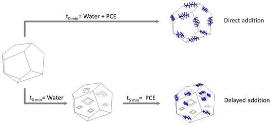 Schematic representation of a C3S crystal and its hydration when PCEs are present from the beginning of hydration (direct addition) and when PCEs were added after hydration starts (delayed addition).