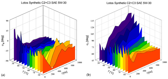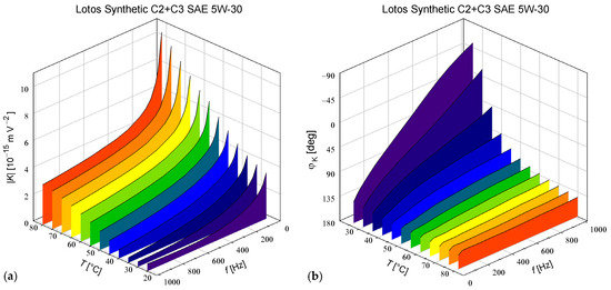 The absolute value (a) and argument (b) of the complex Kerr constant measured in Lotos Synthetic C2+C3 SAE 5W-30 oil as a function of the modulating field frequency and temperature. To increase the readability of Figure 2b, the directions of all axes φK, f, and T are reversed compared to the analogous axes in Figure 2a.