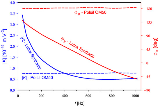 To exclude errors in the measurement procedure as the source of the observed strong frequency dependence of φK, we performed additional measurements at a temperature of 25 °C for Polsil OM50 methyl silicone oil (viscosity 50 cSt), manufactured by Silikony Polskie Ltd., Poland [26], using the same equipment and measurement procedure that was used previously with engine oil. As can be seen in Figure 3, the methyl silicone oil showed an almost frequency-independent absolute value for the Kerr constant of 0.77 × 10−15 m V−2 and a phase close to 180° in the entire frequency band from 37 to 1017 Hz. Due to the high viscosity of this oil, the length of the molecules (a chain of about 50 dimethylsiloxane segments), and the lack of a permanent dipole moment, we can be certain that the frequency is not too low to observe a phase shift between the rotational oscillations of the molecules and the square of the applied alternating field. Therefore, the results show that there is no rotational movement of the molecules. More data on the Kerr constant in methyl silicone oils of various viscosities can be found in [5], but the phase characteristics have not been previously analyzed.