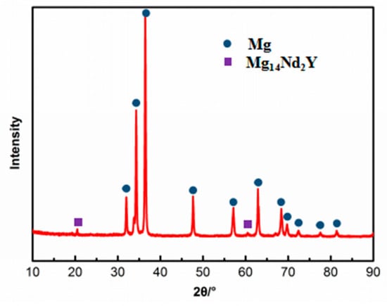 Rolled WE43 that had undergone T5 heat treatment was used in this study. Its chemical composition is shown in Table 1, and the initial microstructure is shown in Figure 1. As observed, the present alloy consists of α-Mg matrix and precipitates, of which the grains are typically fine. Meanwhile, the α-Mg matrix is equiaxed, and precipitates are mainly distributed in the matrix, while a minority of the precipitates are located at the grain boundaries. Figure 2 shows the XRD patterns of WE43 alloy. It is obvious that the phases of WE43 alloy comprise an α-Mg matrix and a β(Mg14Nd2Y) phase. Therefore, it can be concluded that the precipitates in WE43 alloy were β(Mg14Nd2Y).