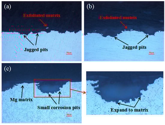 Figure 5 shows the cross-sectional morphology of WE43 alloy after outdoor exposure for different lengths of time. As indicated, the corrosion characteristics of the alloy are always pitting corrosion, corrosion pits that appear jagged, and corrosion pits that tend to be connected to one another as the corrosion progresses, as shown in Figure 5a. Moreover, the exfoliated matrix can be found by analyzing the corrosion pits and the matrix, as shown in Figure 5c. As observed, after pitting occurs, many small corrosion pits appear at the edges of large corrosion pits, and these mainly exist in the Mg matrix. The small corrosion pits show a tendency to expand into the surrounding matrix, as shown in the magnified image of the red rectangle in Figure 5c. Accordingly, it can be speculated that the surfaces of the samples are in contact with humid air, thereby forming galvanic corrosion conditions and causing Mg matrix corrosion, forming corrosion pits. Since the formed Mg(OH)2 corrosion products have a loose porous structure and cannot protect the Mg matrix from the corrosive environment, the corrosion behavior will continue. As a result, the junction between the corrosion pits and the Mg matrix becomes a new location for corrosion, and newly formed small corrosion pits expand around the Mg matrix. After expanding to a certain extent, the adjacent corrosion pits connect to one another, causing the Mg matrix to peel off. Therefore, the macroscopic morphologies of the samples exhibit alternating dark gray and gray-white phenomena with increasing length of exposure time.