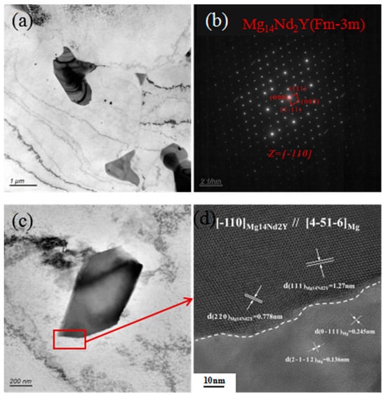 TEM images of WE43: (a) bright-field image, (b) diffraction spots of the secondary phase, (c) morphology of the secondary phase, (d) high-resolution images of the secondary phases.