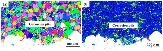 Figure 7 shows the EBSD maps of WE43 after 18 months of outdoor exposure. According to the IPF results, the Mg matrix is a typical recrystallized equiaxed microstructure with fine and uniform grains. Figure 7b illustrates dislocations and lattice distortion near corrosion pits. As demonstrated, the contact position between the corrosion pits and the Mg matrix appears blue, indicating there is no significant dislocation accumulation and stress concentration, and there is no significant stress concentration inside the matrix. This is consistent with TEM images, further demonstrating that the main type of corrosion in WE43 alloy is pitting corrosion, and intergranular corrosion will not occur. Additionally, corrosion pits expand randomly around the Mg matrix during corrosion, because there is no obvious stress concentration inside the WE43 alloy.