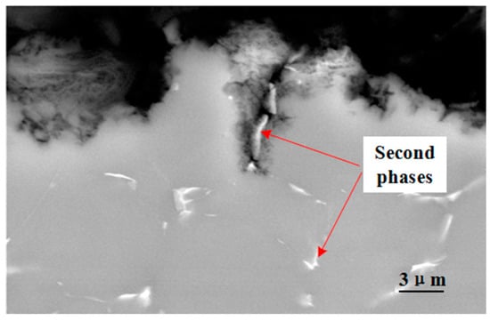 Figure 8 shows the cross section of the corrosion products. It can be found that corrosion behavior occurs near the white second phase under the hot and humid marine atmospheric environmental conditions. Meanwhile, in the corrosion products layer, the second phase remains. This proves that during the corrosion process, the second phase serves as the cathode and the Mg matrix serves as the anode and is continuously consumed.