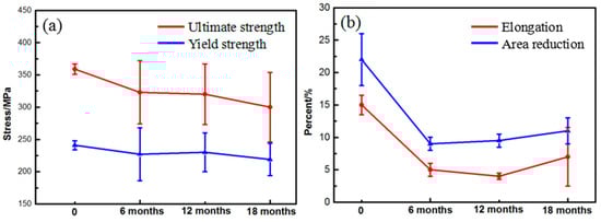 Figure 9 shows the variation in tensile performances of WE43 alloy after outdoor exposure times of different length under hot and humid marine atmospheric environmental conditions. It is obvious that the strength and plasticity of WE43 alloy have undergone significant changes. As shown in Figure 9a, as the exposure time increases, the tensile strength and yield strength continue to decrease. After an 18-month exposure, the ultimate strength of WE43 decreased from 359 MPa to 300 MPa. As shown in Figure 9b, after a 6-month exposure, the elongation and area reduction of WE43 alloy decreased by more than 50%. According to the results of these corrosion characteristics, the alloy would corrode quickly in a humid environment, forming jagged corrosion pits on the sample surface. When stretching, the tips of corrosion pits face the inside of the sample and are perpendicular to the direction of stress, which can easily become the location for crack initiation, resulting in a decrease in the performance of WE43. However, after 6 months of exposure, if the exposure time continues to be extended, the elongation and area reduction of WE43 alloy do not continue to show a decreasing trend, indicating that the impact of corrosion behavior on the plasticity of WE43 is mainly concentrated in the early stage of corrosion.