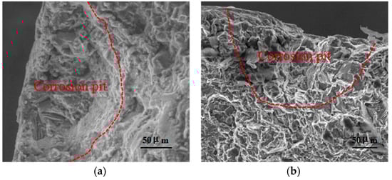 Figure 10 shows the fracture morphology of WE43 alloy after outdoor exposure under hot and humid marine atmospheric environmental conditions. As indicated, the fracture includes two morphologies: One is the dimple-free fracture near the corrosion pits, and the second is the conventional fracture morphology outside the corrosion pits. The above phenomena show that during the stretching process, corrosion pits become the location of crack initiation and the weak points involved in WE43 cracking, while locations other than corrosion pits maintain the original fracture mode and form a large number of dimples, which also explains why the plasticity of WE43 does not decrease with exposure time.