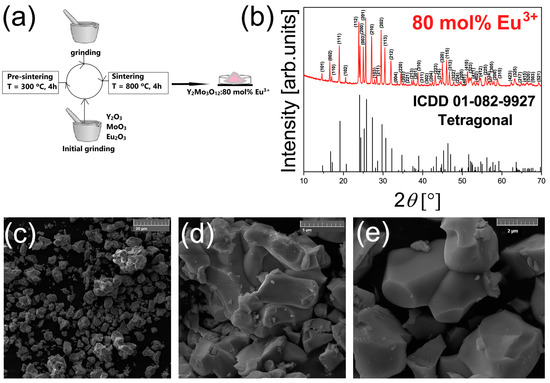 (a) Schematic representation of the synthesis procedure; (b) XRD measurements of the YMO80Eu sample; (c) FE-SEM image of tetragonal YMO80Eu at ×2000 magnification; (d) FE-SEM image at ×10,000 magnification; (e) FE-SEM image at ×20,000 magnification.