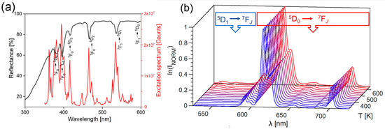 (a) Diffuse reflectance spectra (black line with left y) and excitation spectra (red line with right y) of the probe, at room temperature; (b) Temperature-dependent normalized emission spectra recorded in the 500–750 nm spectral and 300–650 K temperature range.