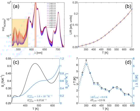 When emissions from adjacent thermalized excited levels are utilized, we are then talking about Boltzmann thermometers, as we explored in our previous work [19]. Since in our case the levels were not narrow and strictly defined and since we do not want to apply computationally demanding tasks like peak sharpening, we redefined the LIR regions based on Figure 3a and used a high seventh-degree polynomial to model the data. By using the high-order polynomial, we want to eliminate, as much as possible, the influence of the model choice on the temperature accuracy analysis: