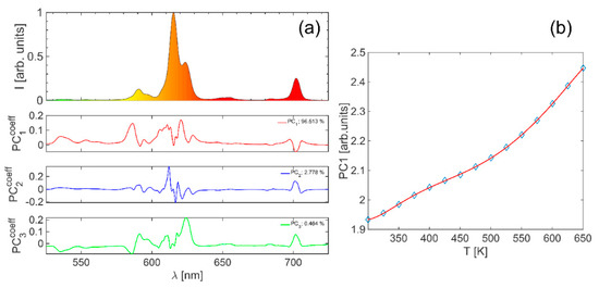 In this approach, normalized spectroscopic data are utilized by treating the intensities at each measured wavelength as features; thus, the number of features equals the number of spectral points, (NSP). Each spectrum (Sj) is associated with its corresponding temperature (Tj), yielding a [Sj, Tj] pair that represents one observation. PCA is used to identify a linear combination of all the features in such a way that it maximizes variance. As a result of the PCA method, NSP principal components (PCi ) were identified, with decreasing variance between NS spectra in the input dataset (in our case Ns = 50 spectra × 15 temperatures = 750). Usually, only the first few components provide a significant contribution to the total distribution variance. Often, it is possible to reduce the whole spectrum to just a single principal component (the first one—PC1). The value of the PC1 can then be used as a thermometric parameter like LIR, band shift, bandwidth, or lifetime.