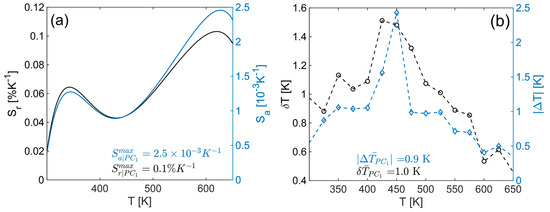 As mentioned, the value of PC1 can be used as a thermometric parameter, and Figure 4b shows the mean value of all from the input at the corresponding nominal temperature (blue diamonds) with the high seventh-order polynomial fit (red line) represented by Equation (5). Based on this, the absolute (Sa—blue line) and relative (Sr—black line) sensitivities, presented in Figure 5a, are calculated and have maximum values of 2.5 × 10−3 K−1 and 0.1%K−1, respectively. The values for accuracy (ΔT–blue diamonds) and resolution (δT–black circles), presented in Figure 5b, are calculated based on the distribution of control set (50 spectra not used during PCA calculation) temperature readouts as mean and standard deviation values at each fixed temperature, respectively. The average values in the observed temperature range were found to be 0.9 K for ΔT and 1.0 K for δT.