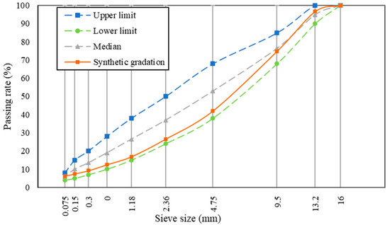 The AC-13 graded asphalt mixture was designed by the Marshall design method. Generally, 2.36 mm is the key control sieve size, and its passing rate is lower than the median value of the target sieve size range when the mixture gradation is the coarse gradation. Owing to the better skeleton structure and high temperature stability, the coarse gradation of AC-13 was selected in this paper. After several trials, the final design grading curve is reported in Figure 3.
