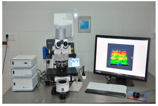 Under certain fluorescent irradiation conditions, the basalt fiber coated with the infiltrator and SBS modifier will show a yellow (bright) color; by contrast, the asphalt will show a black (dark) color. Therefore, the LSM 700 3D measurement laser microscope, as shown in Figure 4, produced by Carl Zeiss in Germany was used to capture the distribution photo of fibers in the asphalt binders. A 405 nm solid-state laser was adopted to acquire the fluorescence microscopic images of fiber–asphalt binders at 100 μm magnification. The steps to prepare the observed samples were as follows: