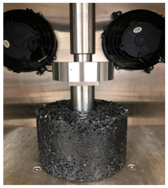 Uniaxial penetration tests can not only measure the shear strength of asphalt mixtures but also reflect the actual stress state of the asphalt materials in the pavement structure [34]. According to the JTG D50-2017 specification [35], cylindrical samples with a diameter of 150 mm and a thickness of 100 mm were prepared by the rotating compactor. The samples were placed into the chamber of the UTM-25 testing machine, and a metal indenter with a diameter of 42 mm and a thickness of 50 mm was placed above the samples. The test loading rate and temperature were set as 1 mm per minute and 60 °C, respectively. The loading diagram of the uniaxial penetration test is shown in Figure 5. The penetration strength (RT) is calculated in compliance with Equations (1) and (2) [36].