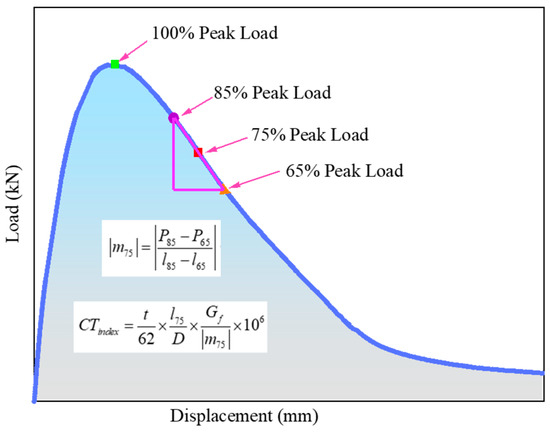 The IDEAL-CT test was adopted to test the cracking resistance of asphalt mixtures at medium temperatures according to ASTM D8225-19 [37]. Figure 6 presents the load–displacement curve of the experiment. It can be divided into two stages: the left part before the 100% peak load exists is called the crack initiation stage, while the right part is called the crack propagation stage [38]. Therefore, this test focuses on capturing the load value and the corresponding vertical displacement. CTindex is determined by analyzing the load–displacement curve, and the larger CTindex value means better anti-cracking ability. In this study, samples with a diameter of 150 mm and a thickness of 62 mm were formed by the rotary compactor. The compression load was applied to the sample at 25 °C under a constant rate of 50 mm/min. It was worth mentioning that the cylindrical asphalt mixture samples were subjected to indirect tension along the diameter plane direction.