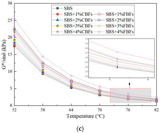 The results of complex shear modulus and rutting factor before and after adding basalt fibers are illustrated in Figure 8b,c. The results of G* and G*/sinδ values of asphalt binders decrease sharply with the increase in temperature, indicating that temperature is an important factor affecting the modulus values of asphalt binders, which also verifies the previous findings [23,25,40]. The curves between temperature and the complex modulus/rutting factor of fiber–asphalt binders are higher than those of SBS original asphalt, which indicates that fiber–asphalt binders have better deformation resistance at high temperatures. The curves of asphalt binders containing flocculent basalt fibers remain at the top all the time, and the index of asphalt binders with 4% flocculent basalt fiber increases remarkably, mainly because the high flexibility of flocculent basalt fiber can reduce the overall stiffness of asphalt binder.