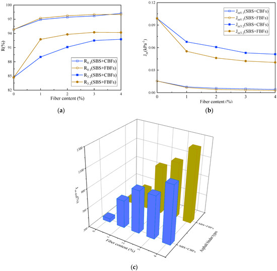 Previous studies [13,23,41] have shown that Jnr is used to reflect the nonlinear rheological response of asphalt under large stress, and it has a good correlation with the rutting resistance of asphalt mixture. When the stress increases, the R values of asphalt binders decrease hastily and the Jnr values increase drastically to a different degree, which indicates that the effect of “heavy load” on the resistance to permanent deformation of asphalt binders bears a resemblance to the “high temperature”. In other words, the stress and temperature have some kind of equivalence. Under the shear stress of 0.1 kPa at 64 °C, the rheological properties of asphalt binders are basically in the linear range. With the increase in stress level, the differences in R and Jnr between fiber–asphalt binders and the control group become more obvious. Moreover, the rheological properties of asphalt binders are likely to have entered into the nonlinear range, which should be able to simulate the situation of asphalt pavement under large loads. More specifically, the elastic recovery rates of asphalt binders are improved and non-recoverable creep compliances decrease after adding fibers. The improvement amplitude tends to be stable with the increase in the dosage. The R/Jnr curves of the chopped basalt fiber asphalt binder tend to be flat when the fiber dosage is 3%, whereas it tends to flatten out with a 2% fiber dosage for flocculent basalt fiber.