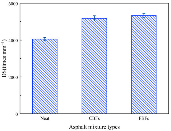 The DS values of different asphalt mixtures are shown in Figure 10. It was obvious that the DS values increased after adding basalt fibers. Compared with the control group, the DS value of asphalt mixture with CBF increases from 4050 to 5175 times·mm−1, and the increasing extent is 28%. The DS value of asphalt mixture with FBFs increases from 4050 to 5335 times·mm−1, with a 32% increasing extent. Some scholars believe that fibers can better bond the asphalt and aggregate together, which could help to better resist the rolling loads [17,42,43]. Additionally, the highest DS values belong to the samples with FBFs, which show a slight advantage on the high temperature rutting resistance. This is because CBFs are dense and smooth, resulting in low fiber oil absorption rates. While the structure of the FBF is more complex, it can contribute to absorbing more asphalt. This phenomenon agrees with the results of the SEM test [23]. The high fiber oil absorption rate is conducive to preventing the segregation and overflow of the asphalt binder under high-temperature conditions.