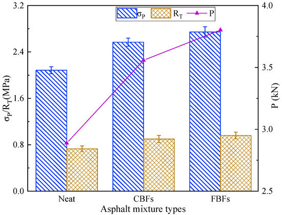 Figure 11 illustrates the effects of the two basalt fibers on the uniaxial penetration test of the examined asphalt mixture samples. Compared with the control group, the P values of asphalt mixtures increase to 3.558 kN for mixtures containing CBFs and increase to 3.802 kN for mixtures containing FBFs. Simultaneously, the penetration strength value of the mixture increases by 23.2% for the mixture containing CBFs, and it increases by 31.6% for mixtures containing FBFs. The reason is mainly because the basalt fibers can absorb free asphalt in the mixture, which can be transformed into structural asphalt. Then, the aggregates are bonded to form a frame support in the mixture, thereby enhancing the shear deformation resistance of asphalt pavements.