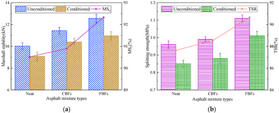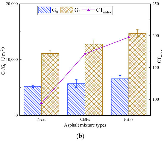 The shear force transferred from the road surface under traffic load accelerates the stripping and spalling of aggregates, leading to the aggravation of water damage [45]. Water immersion stability test results have been presented in Figure 14a. Compared with the control group, the Marshall stability values of the asphalt mixture with CBFs before and after the immersion process are slightly increased and the MS0 values are almost unchanged. However, the relevant indexes of the asphalt mixture after the adding FBFs are improved evidently, and the MS0 value increases by about 20.0%. The explanation may be that the presence of fibers plays a crucial role in increasing the consistency of the asphalt binder and improving the binding effect with aggregates. As mentioned before, FBFs can better absorb the light components in asphalt, increasing the thickness of asphalt film. In addition. It could then improve the bond strength as well as prevent water from entering the interface between asphalt and aggregates effectively.