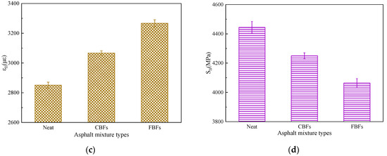As is shown in Figure 13a, at −10 °C, the samples with FBFs have the maximum damage load, while the samples with CBFs have the minimal mid-span deflection. On the contrary, the control group has minimal damage load and maximum mid-span deflection. This demonstrates that the basalt-fiber-modified asphalt mixtures have stronger toughness and better crack resistance at low temperatures. The explanation may be that the asphalt becomes harder and more brittle under low-temperature conditions, which makes the adhesion between the fiber and the asphalt worse, resulting in the insignificant bridging effect. As shown in Figure 13b–d, after adding CBFs or FBFs, the flexural tensile strength (RB) values of asphalt mixtures increase by 2.36% and 4.72%, the failure strain (εB) values enlarge to 3067 με and 3267 με, and the bending stiffness modulus (SB) of asphalt mixture reduces by 4.37% and 8.55%, respectively. As mentioned before, the oil absorption rate of FBFs is relatively high, which promotes the flexibility of the asphalt mixture and forms more asphalt films. As a result, FBFs play a better role in filling and healing the micro-cracks between the aggregates.