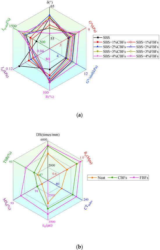 Radar maps: (a) rheological behavior of different asphalt binders with 1% fiber dosage; (b) pavement performance of asphalt mixtures.