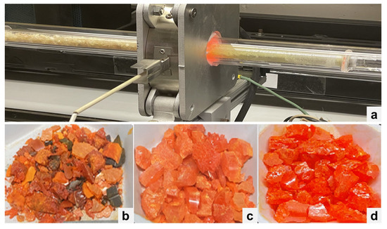 Crystals with a low defect density are crucial for semiconductor spectrometer performance. Such crystals are usually grown with >5 N precursor materials. The raw starting materials CsX and PbX2 (X = Cl, Br, I) with 4–5 N purity levels were ordered from different chemical vendors. The growth process was started by synthesizing CsPbX3 with the as-received materials. The synthesized material was then used as a charge for initial growth runs. Purification of the synthesized charge was carried out when the purity level was considered not acceptable, based on the crystal color or appearance, material analysis using a differential scanning calorimeter, and the device performance. The zone-refining technique [17] was used for the purification of each binary compound CsX and PbX2, as well as the synthesized CsPbX3 compounds, respectively. Figure 1a shows the zone-refining system and ampoule used to purify CsPbBr3. Figure 1b shows the CsPbBr3 materials synthesized from the materials as received from the vendors, showing the inclusion of possible carbonaceous or organics impurities. Figure 1c shows the cleaned CsPbBr3 that was subsequently used as the charge for the zone-refining process. Figure 1d shows the zone-refined CsPbBr3 material that was then used as the growth charge. Material colors observed as seen in Figure 1b–d can be a visual indicator to the quality of the starting growth materials for CsPbBr3.