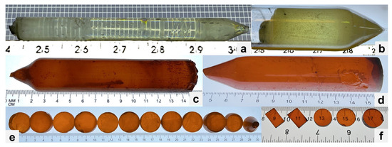 (a) CsPbCl3 grown with purified materials. (b) CsPbCl3 grown with non-purified materials. (c) CsPbBr3 grown with non-purified materials. (d) CsPbBr3 grown with purified materials. (e) CsPbBr3 wafers cut transversely. (f) CsPbBr3 samples cut longitudinally and transversely.