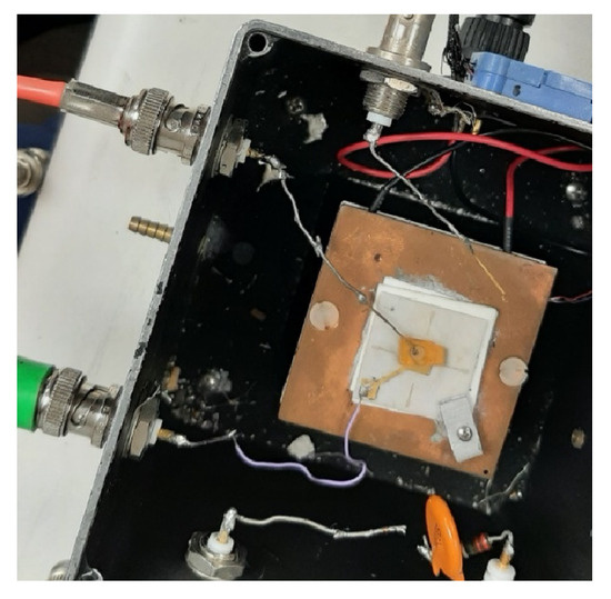 After growth, the crystal boule was removed from the ampoule and then cut with a diamond wire saw. The crystal boule was cut either longitudinally (along the axis of the boule) or transversely (crosswise). Figure 2e shows CsPbBr3 crystal samples cut transversely off the boule, while Figure 2f shows rectangular crystal samples cut longitudinally (along the boule) and circular platelet samples from the boule cut transversely. The cut samples were then lapped (roughly polished) and finely polished with Al2O3 or SiC polishing papers. Prior to contact deposition, samples were cleaned for less than 10 s in hexane and dried with lint-free wipes. Metal contacts were deposited using RF sputtering. The polished crystals and fabricated devices underwent characterization by several methods. Optical microscope was used to determine cutting direction and crystal quality. Transmission/absorption measurements of polished crystal samples were performed using Agilent Cary 4000 UV–VIS. Current–voltage (I–V) measurements were conducted using a test box fabricated in-house (Figure 3) and a Keithley 237 High Voltage Source Meter unit. Photocurrent spectroscopy was carried out using the same test box now covered by a lid with an aperture to allow light from an Oriel (Newport) 100 W quartz tungsten halogen lamp to reach the sample. Monochromatic light was produced using an Oriel (Newport) C130 monochromator, with the wavelength varied from 200 to 1000 nm in steps of 5 nm. During this variation, the voltage across the sample was maintained at a constant bias. The mobility–lifetime (μτ) product was estimated using photocurrent spectroscopy and alpha particle spectroscopy.