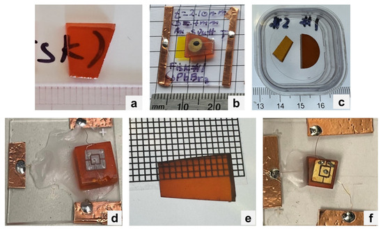 (a) CsPbBr3 sample sent to RMD. (b) Planar device fabricated from the sample in (a). (c) CsPbBr3 samples sent to Penn State. (d) CsPbBr3 sample fabricated into a device at Northwestern. (e) CsPb(Br,I)3 sample sent to Northwestern. (f) CsPb(Br,I)3 device fabricated from the sample in (e).